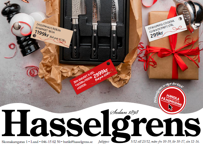 Mitt i centrala Lund hittar du Hasselgrens Glas & Porslin. En anrik butik som funnits på samma ställe sedan 1898. I butiken finns ett stort sortiment av inredningsprodukter och husgeråd från många kända varumärken. Här finns något för alla tillfällen och smaker. Vi som arbetar i butiken har lång erfarenhet i branschen och hjälper gärna till!