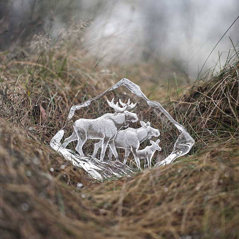 Gjutet kristallblock med graverat och sandblästrat motiv av en älgfamilj. Blocket är handgjort i Målerås och signerat i botten. Blocket levereras i en presentkartong. Design Mats Jonasson BxH=255x185 mm Vikt: 3 kg