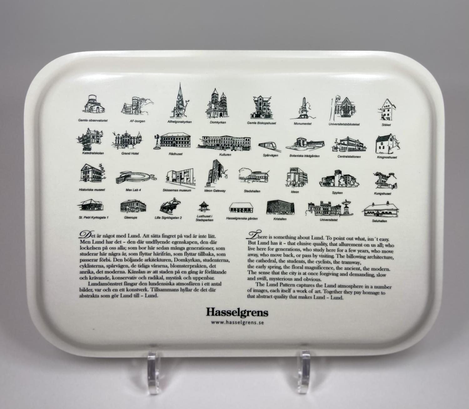 Bricka med mönster av kända Lundabyggnader. Säljs exklusivt hos Hasselgrens Glas & Porslin. Lundabrickan, lundabricka, lund