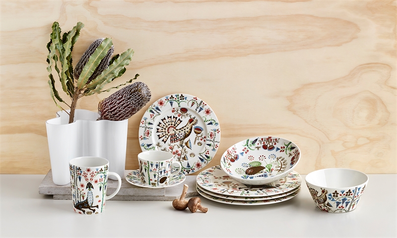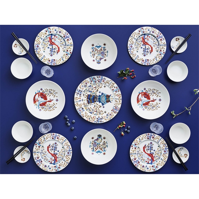 Taika (magi på finska) är en lekfull blandning av Klaus Haapaniemis mycket fantasifulla konst och Heikki Orvolas rena design. Resultatet är en magisk serie som inspirerar till kreativitet och sagoberättande i en enkel och ren design. De färgstarka karaktärerna livar upp vardagen med folklore och sagor. Den tåliga servisen kan användas till mycket och ger varje dukning en rolig touch. De rundade kanterna gör Taika-fatet perfekt för kaffe- och cappuccinokoppar. Den rena vita färgen i kombination med den starka färgpaletten framhäver det detaljrika ugglemönstret. Skapa livfulla kombinationer genom att mixa och matcha olika färger. Samla på alla delar. En vacker bröllops- eller inflyttningspresent. Tål mikrovågsugn och maskindisk.