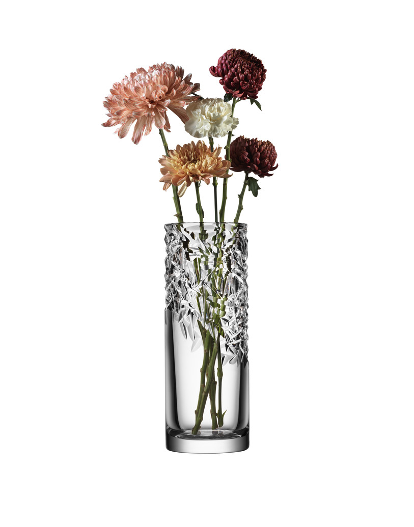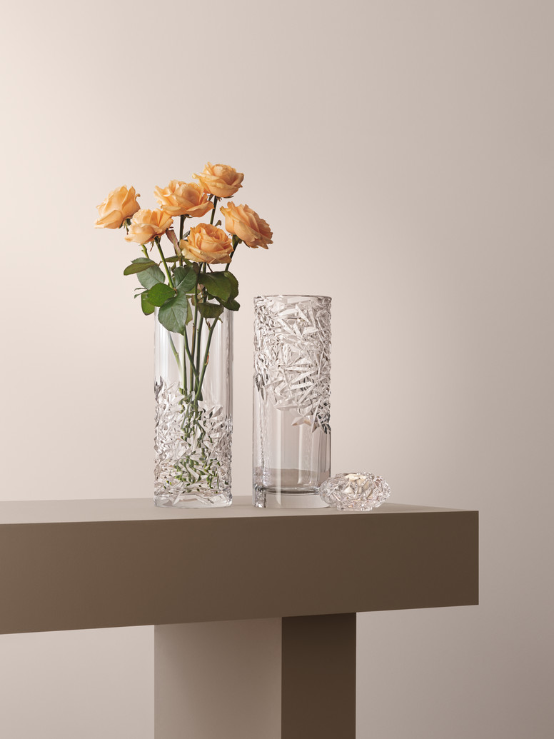 Serien Carat bygger på en samtida tolkning av traditionell glasslipning som har gjort Orrefors världsberömt. Den oregelbundna geometrin skapar vackra reflektioner av ljus i kristallglaset. Den stora cylindervasen har ett oregelbundet mönster upptill som kontrast till det släta glaset. Lämplig för högre snittblommor eller nakna grenar. Formgiven av Lena Bergström. Carat Vas High Cut