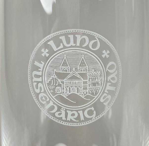 Champagneglas med mönster av kända Lundabyggnader. Säljs exklusivt hos Hasselgrens Glas & Porslin