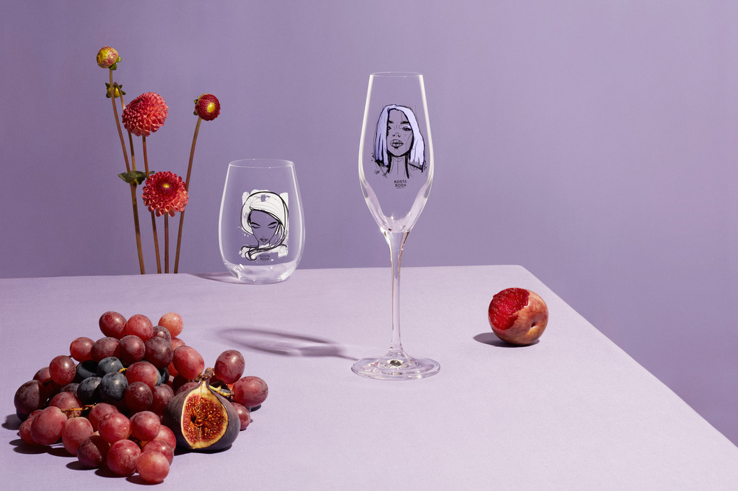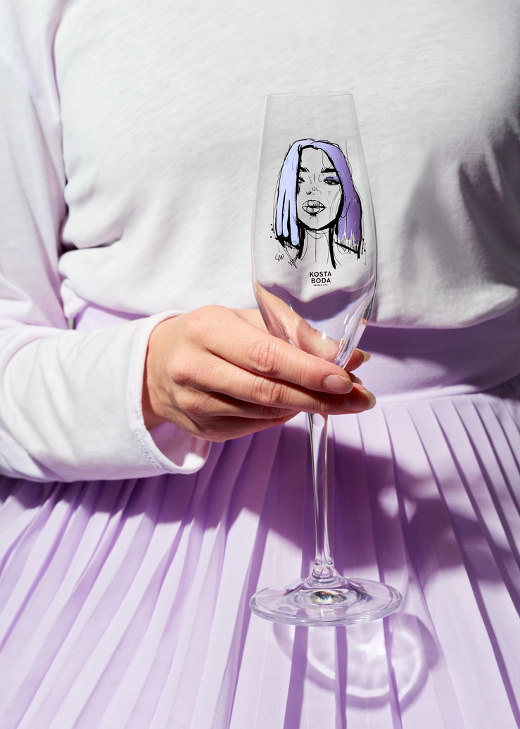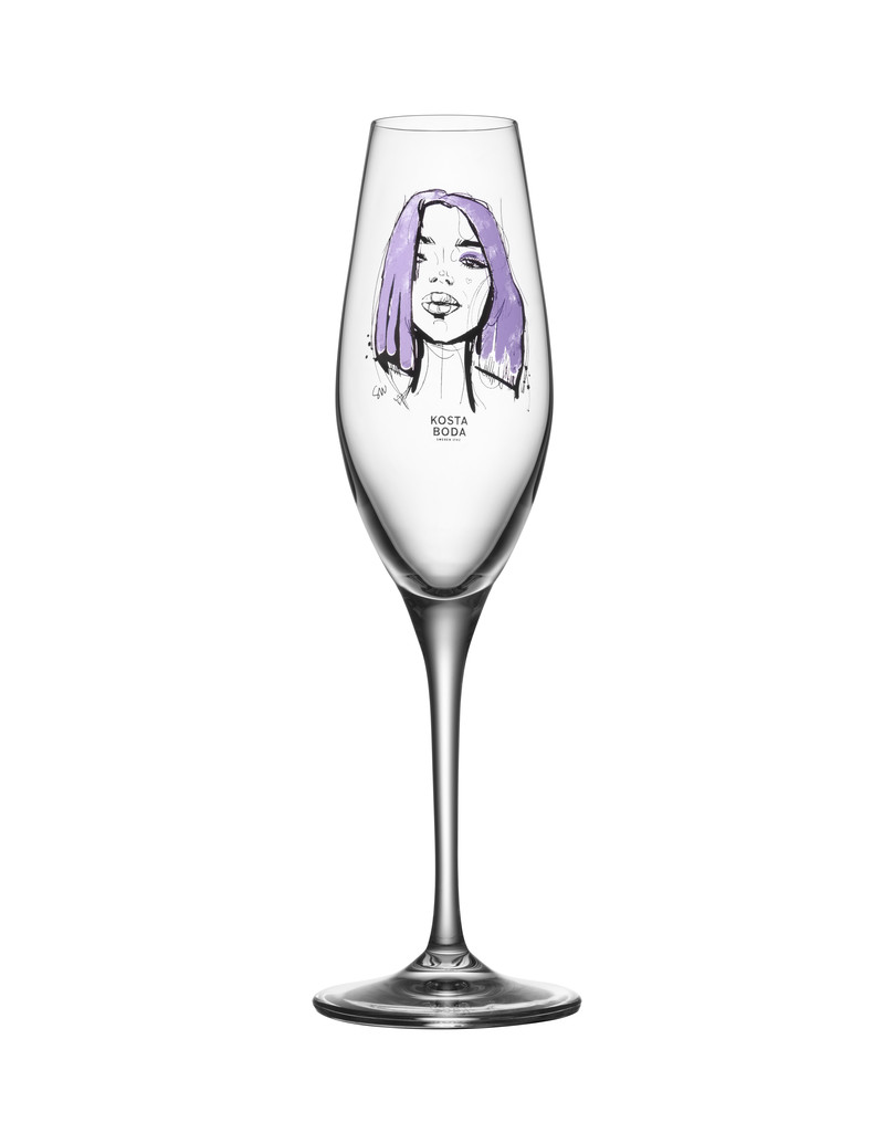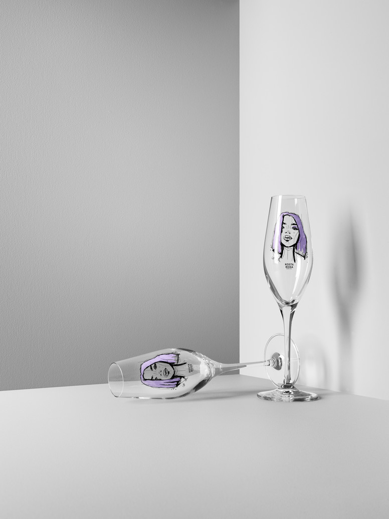 Champagneglasen i serien All About You från Kosta Boda handlar om kärlek, längtan och passion - starka känslor fångade i glas med sparsmakad design och illustrerade motiv med influenser från modevärlden. Glaset Forever Mine är ljuslila, en färg som är utvald för att symbolisera glädje. Design Sara Woodrow.