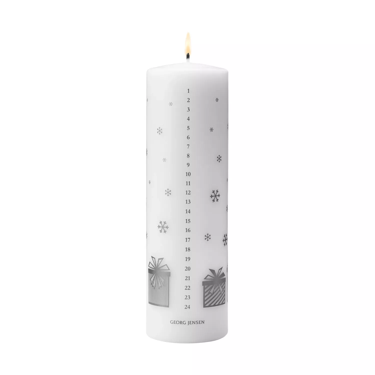 Räkna ner till julafton med detta eleganta kalenderljus som är dekorerat med silverfärgade motiv föreställande vackra julklappar och dalande snöflingor. Med sitt mjuka sken skapar ljuset en stämningsfull advent så att du varje dag kan njuta av nedräkningen till julafton.