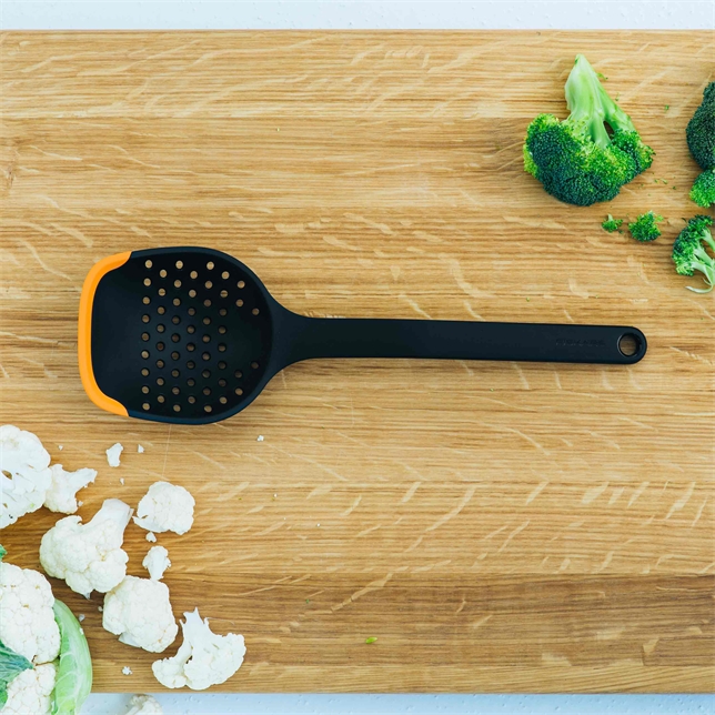 Functional Form ger praktiska och enkla lösningar för din dagliga matlagning. Verktygen är konstruerade för att vara lätt att använda, rengöra och förvara. Functional Form hålslev silar enkelt bort vätska från grönsaker, makaroner eller dumplings t.ex. Redskapets silikonkant skyddar beläggningen på din stekpanna eller gryta mot repor. Integrerat verktygsstöd håller köksdiskarna rena. Kan diskas i diskmaskin.