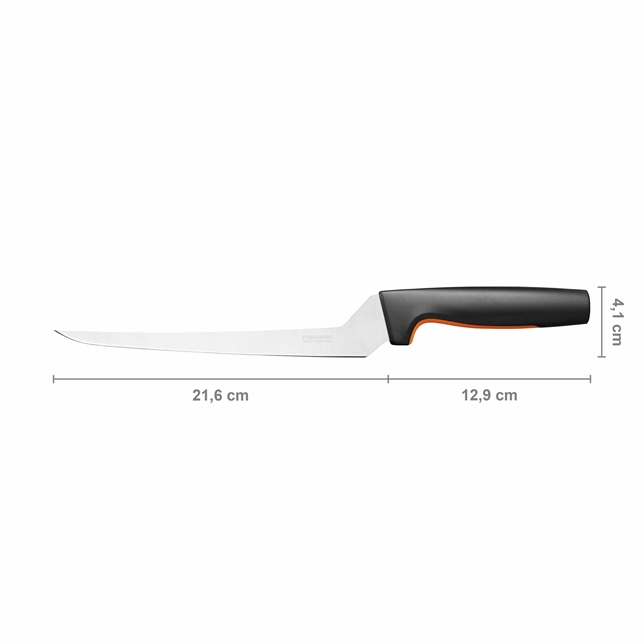 För hemmakockar som uppskattar lättskötta och smarta köksredskap. Fiskars® Functional Form™ Filékniv har ett smalt och flexibelt blad i japanskt rostfritt stål som passar perfekt för att filea kött och fisk med. Det ergonomiska handtaget har SoftGrip™ och ett djupt fingerskydd för en bekväm och säker passform i din hand. Liksom alla Functional Form™ knivar kan denna maskindiskas. Designad i Finland.