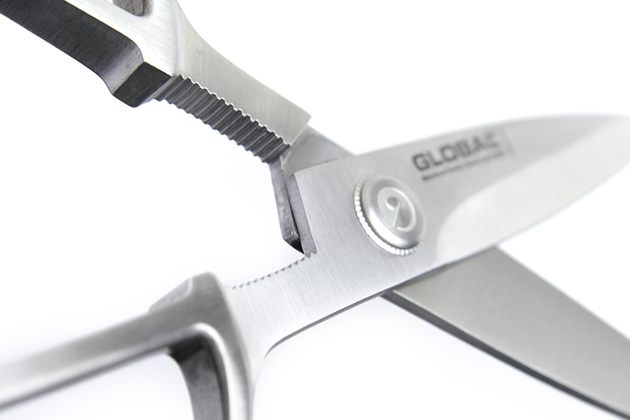 Globals kökssax är utrustad med en mängd smarta funktioner. Till exempel har den en klo som du kan använda till att knäcka nötter eller kräftor. Handtaget smalnar även av i en kil som hjälper dig att bända upp svåröppnade burkar. Saxens blad har en microtandad egg som ger ett perfekt snitt när du klipper. Bladet justerar du enkelt med en skruv.