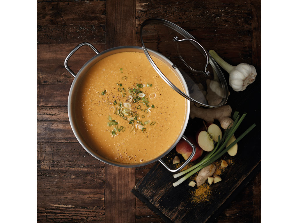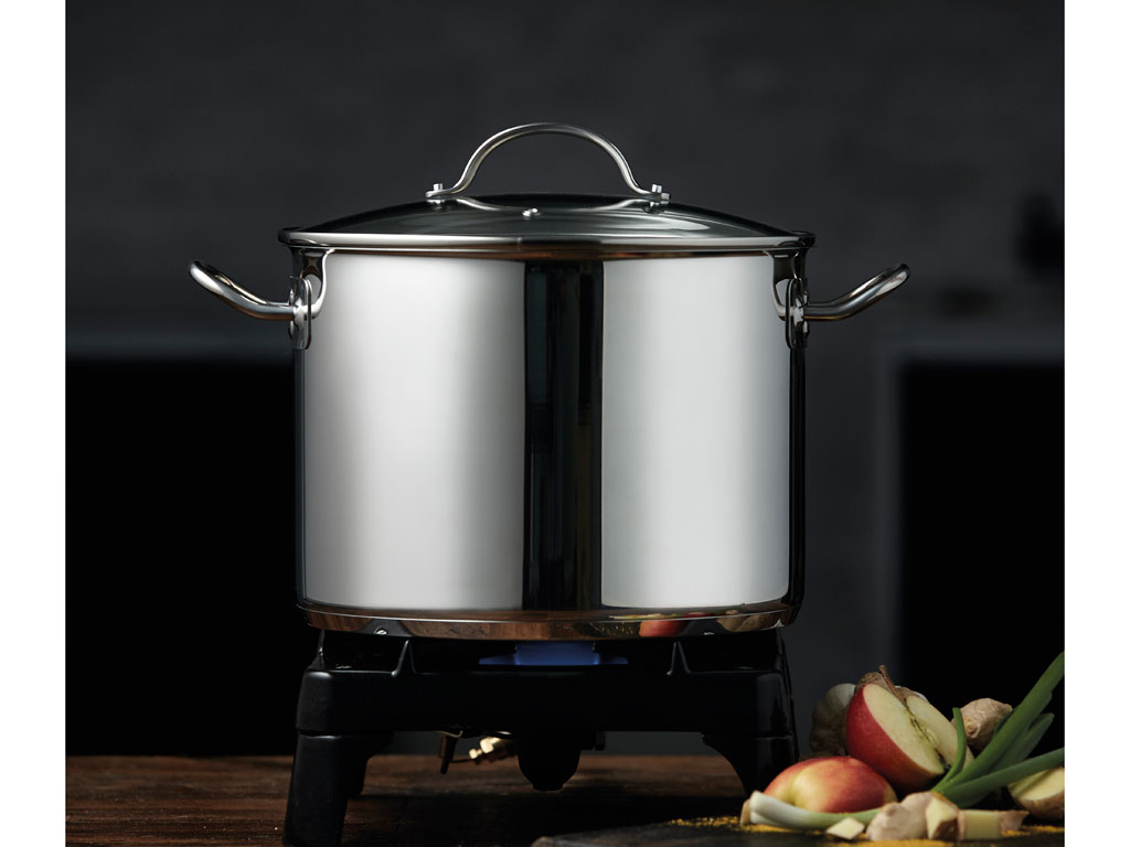 Soppgryta från Funktion, 10 liter, tillverkad av 18/8 rostfritt stål med kraftig indukdtionsbotten, blankpolerad utvändigt, mattpolerad invändigt och med måttskala. Glaslock med ånghål medföljer.