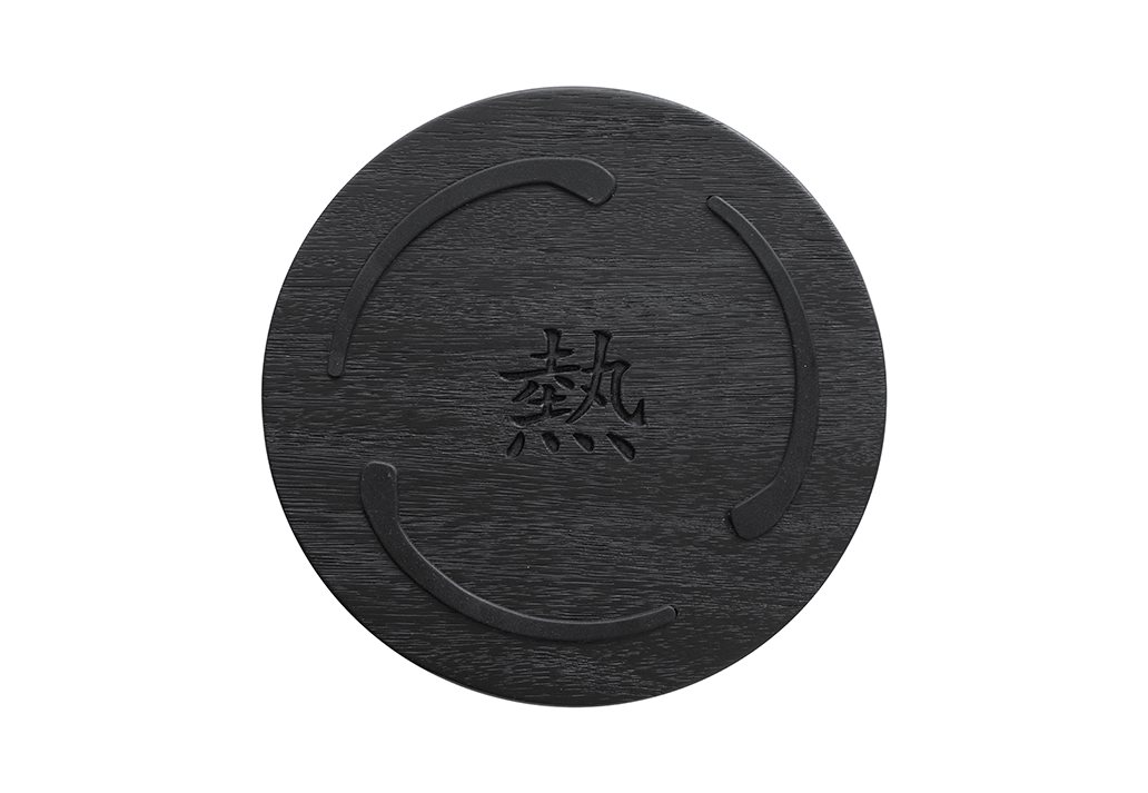 Underlägget är tillverkat av svartlackerat akaciaträ och ovansidan är prydd med ett tunt silikonmönster inspirerat av den japanska cirkeln "Ensō", vilket ger ett stabilt och mjukt stöd för varma kärl. I mitten är den japanska symbolen 熱 (Hetta) ingraverad, och på kanten Satakes numera klassiska logo.