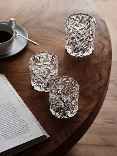 Serien Carat bygger på en samtida tolkning av traditionell glasslipning som har gjort Orrefors världsberömt. Den oregelbundna geometrin skapar vackra reflektioner av ljus i kristallglaset. Carat Votive finns i två storlekar. Formgiven av Lena Bergström.