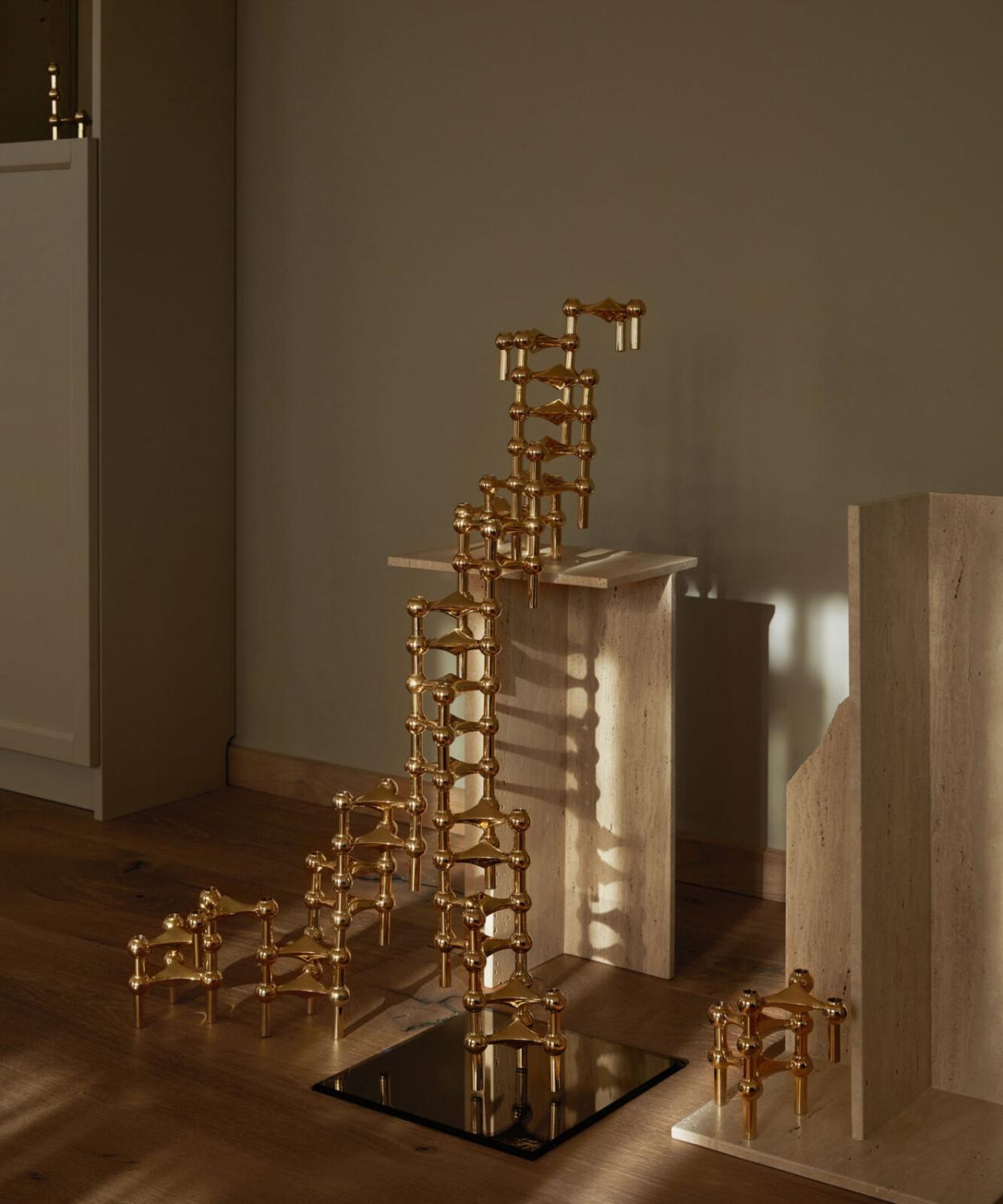 Ljusstakarna Nagel i mässing från Stoff är seriens mest exklusiva ljusstake. Setet innehåller 3 delar som du kan ha var för sig eller sätta ihop till en stor ljusstake. Detta är en ljusstake du kan ha genom livet och komplettera med fler delar allt eftersom.