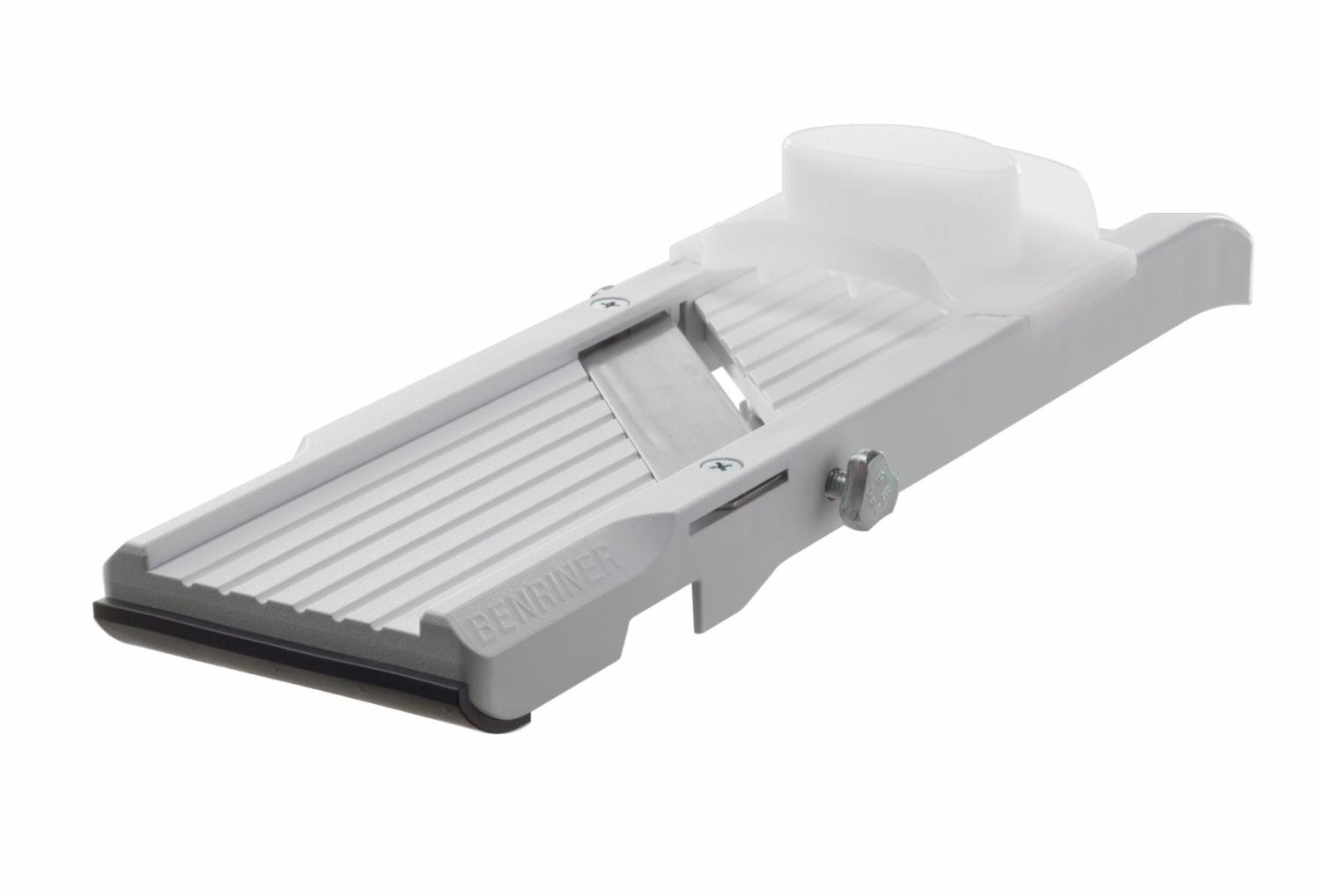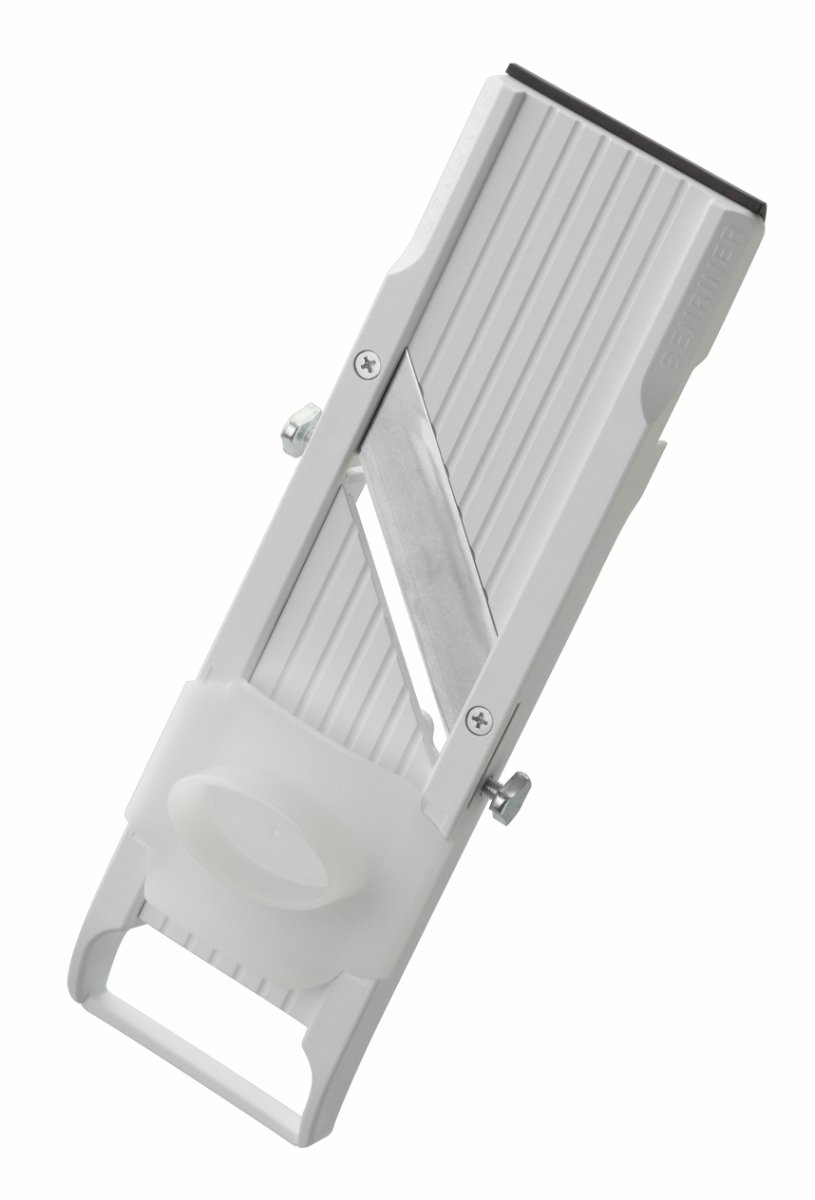 En förstklassig mandolin från Benriner som skär grönsaker och rotfrukter i tunna skivor eller strimlor. Det raka bladet är handslipat och har en steglös inställning, från 0,5 till 7 mm. Mandolinen levereras med tre utbytbara blad för strimling och julienne samt ett praktiskt fingerskydd. Undertill finns ett glidskydd som underlättar användningen.