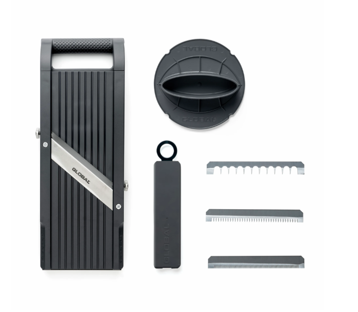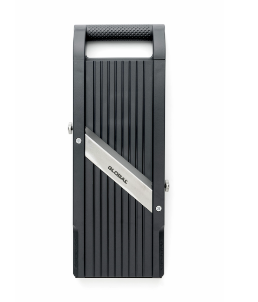En sylvass mandolin är ett måste för varje ambitiös hemmakock. Det fasta, raka skärbladet är handslipat och hjälper dig att få till perfekta skivor av grönsaker och rotfrukter. På baksidan av mandolinen finns en ratt där du justerar tjockleken på skivorna, från 0,5 mm till 8 mm. Undertill är mandolinen utrustad med ett glidskydd och i nederkant finns även en klack som håller mandolinen på plats när du håller den över en skål eller bunke. Mandolinen från Global levereras med ett praktiskt fingerskydd samt tre tandade blad för stavar i olika grovlekar. Det raka skärbladet går också att slipa om.