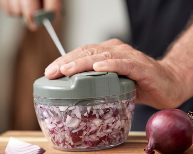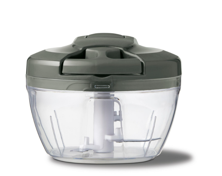Minihackaren med lock med dragsnöre är den snabba lösningen för att hacka och skiva örter, grönsaker, frukt, ost och mycket mer. Behållaren och locket är tillverkade av PP, de tre böjda bladen är tillverkade av rostfritt stål.