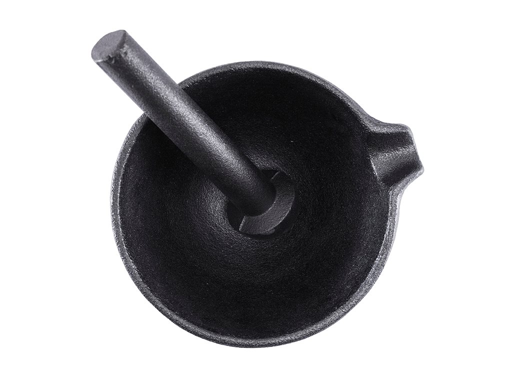 Satakes gjutjärnsserie Nabe innehåller grytor i olika storlekar, en riktigt läcker wok samt denna vackra gjutjärnsmortel med praktisk pip och greppvänlig stöt. Tyngden i morteln är perfekt då den står riktigt stadigt på köksbänken och stötens tyngd gör arbetet enkelt. Krossar lätt alla sorters kryddor i morteln.