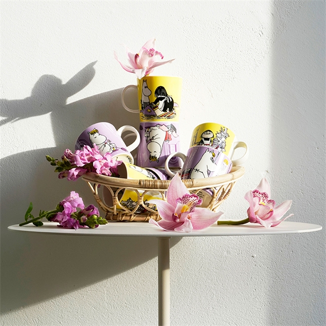 Snorkfröken charmar och tycker om att bli charmad. Hon är kvinnlig och fåfäng men även hurtig och kvicktänkt. Hon provar en bikini men spegelbilden faller henne inte i smaken. Snorkfröken visar sina känslor genom att byta färg. Moomin by Arabia, mugg 0,3L, Snorkfröken. Mumin, muminmugg, Tove Jansson
