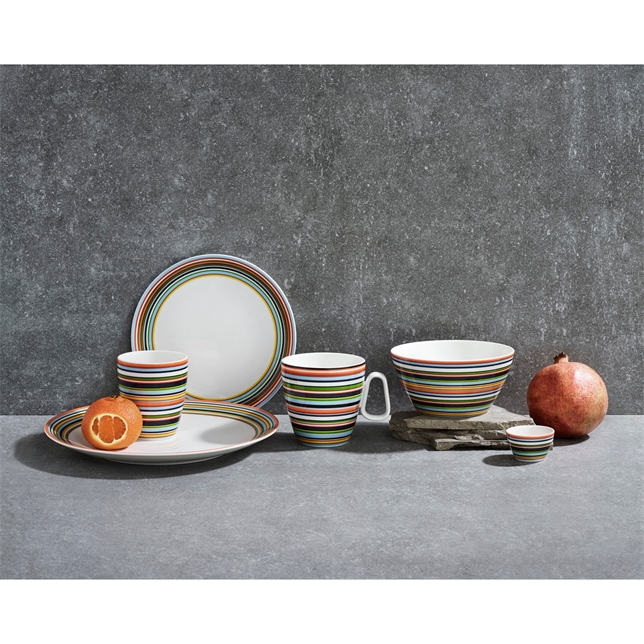 Den välkända produktdesignern Alfredo Häberli skapade Origo i avsikt att designa en mångsidig serie med många funktioner. Serien har ultrapraktiska detaljer som ringar för stapling av delar och möjlighet att fästa koppar och skålar i fat och tallrikar. Tillverkad av ett vackert porslin som är både praktiskt och tillräckligt tåligt för vardagsbruk. Randmönstren i livfulla färger ger serien en kraftfull och modern accent. Mixa och matcha olika delar eller kombinera med delar från andra Iittala-serviser för att skapa effektfulla kombinationer. Möjligheterna är oändliga. Fick den prestigefulla utmärkelsen iF Design Award 2002. Unna dig en mysig stund med kaffe, te eller varm choklad i den stora orange Origo-muggen. Samla på alla delar. En populär present. Tål maskindisk.