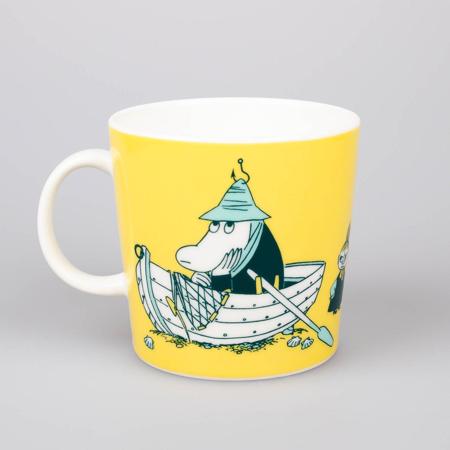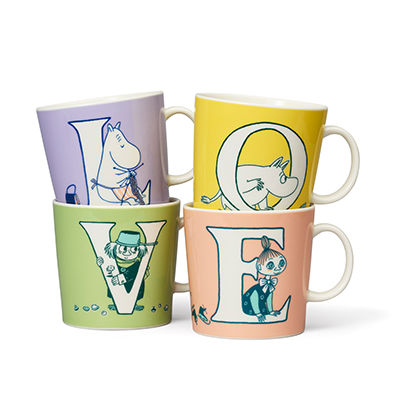 Bokstäverna på porslinsmuggarna är baserade på Tove Janssons handritade bokstavsillustrationer och på varje mugg finns även unika karaktärer från mumintrollens värld, både på fram och baksidan.