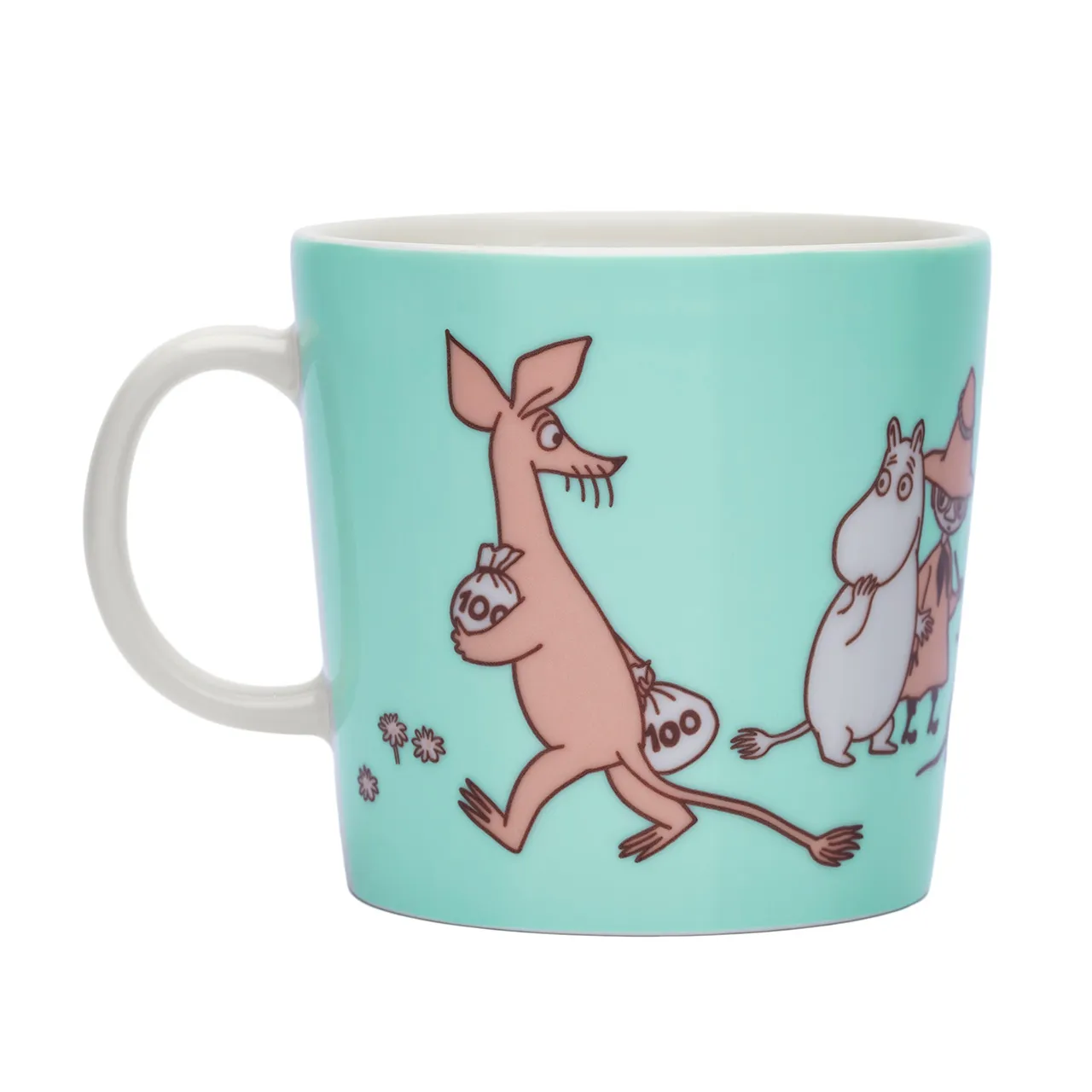 Bokstäverna på porslinsmuggarna är baserade på Tove Janssons handritade bokstavsillustrationer och på varje mugg finns även unika karaktärer från mumintrollens värld, både på fram och baksidan.
