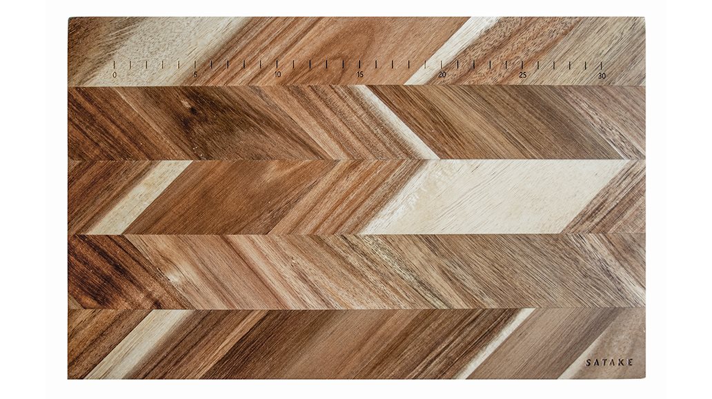 Vacker skärbräda av Akaciaträ från Satake. Brädan har centimetermarkeringar för att förenkla och öka precisionen av tjockleken när du skivar till exempel zucchini, kött eller bröd.