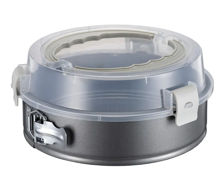 Du bakar tårtan direkt i den slitstarka springformen, som enkelt monteras på det emaljerade fatet. Den högkvalitativa non-stick-beläggningen som är helt fri från PFAS säkerställer att tårtan släpper smidigt. När tårtan är klar, fäster du det praktiska locket med dess tre säkra lås och handtag – perfekt för trygg transport till kalaset.