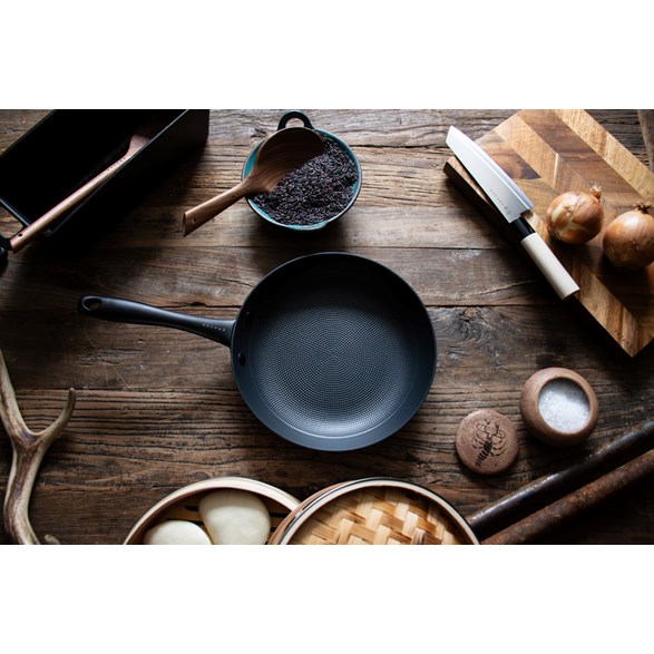 Succen med Satake Lättviktsgjutjärn Honecomb lyfter nu till en ny nivå för nu lanseras den nya serien med en keramisk non-stickbeläggning som är fri från tillsatt PFAS, syntetiska material och tunga metaller. Ytterligare en nyhet är de mattsvarta handtagen och detaljerna. Kanske världens snyggaste traktörpanna? Den honeycombmönstrade ytan fördelar värmen jämnt och ger en perfekt yta på råvarorna. En superb panna för alla typer av stekning – grönsaker, fisk och kött.