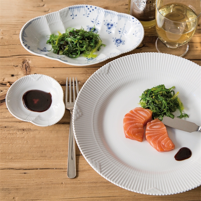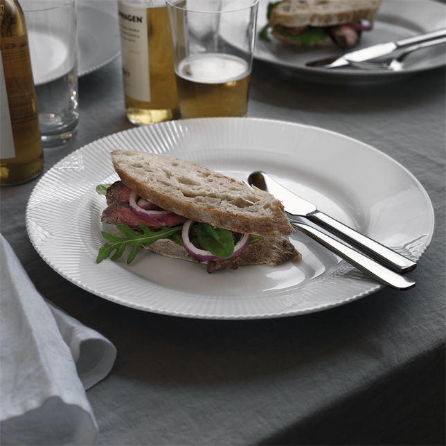 28 cm Vit Elements Tallriken är den största av tallrikar i samlingen. Den stora ytan ger mer utrymme för de handgjorda flöjterna, vilket skapar en enastående del av taktilitet, kompletterad med en kantad kant inspirerad av den ikoniska kollektionen av Flora Danica. Den stora tallriken är idealisk att använda som middagstallrik eller serveringsfat i en lekfull dukning. Genom att designa White Elements väckte Louise Campbell liv till en charmig och överraskande kombination av värdefulla designelement från Royal Copenhagens mest klassiska kollektioner. I en ny version av traditionen innehåller kollektionen flöjterna från Musselmalt Plain, spetsbården från Musselmald Half Lace och den taggiga kanten från den ikoniska Flora Danica. Den överraskande användningen av klassiska element på det vita porslinet gör varje del modern och helt sin egen.