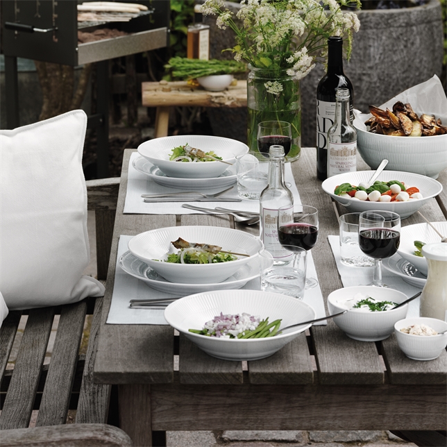 Denna vita räfflade 24 cm djupa tallrik ekar designen av den mindre djupa tallriken i kollektionen, men ändå verkar de handsnidade flöjterna förstärkas av den större ytan. Tallrikens storlek gör den mångsidig och ett favoritelement på alla matbord. White Fluted är skapad från basformen i Blue Fluted Plain-kollektionen och är minimalistisk, osmyckad och evigt klassisk. Den rena vitheten i den enkla kollektionen gör att varje pjäs sticker ut den handgjorda elegansen, och framhäver de ikoniska flöjterna i porslinet. Varje bit av White Fluted är vacker för sig och i kombination med en eller flera av Royal Copenhagens handmålade middagsserviser.
