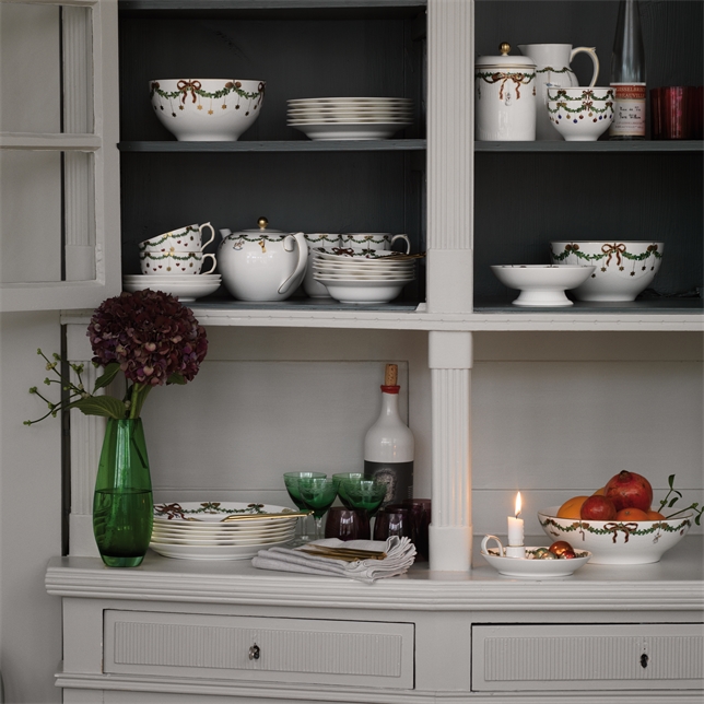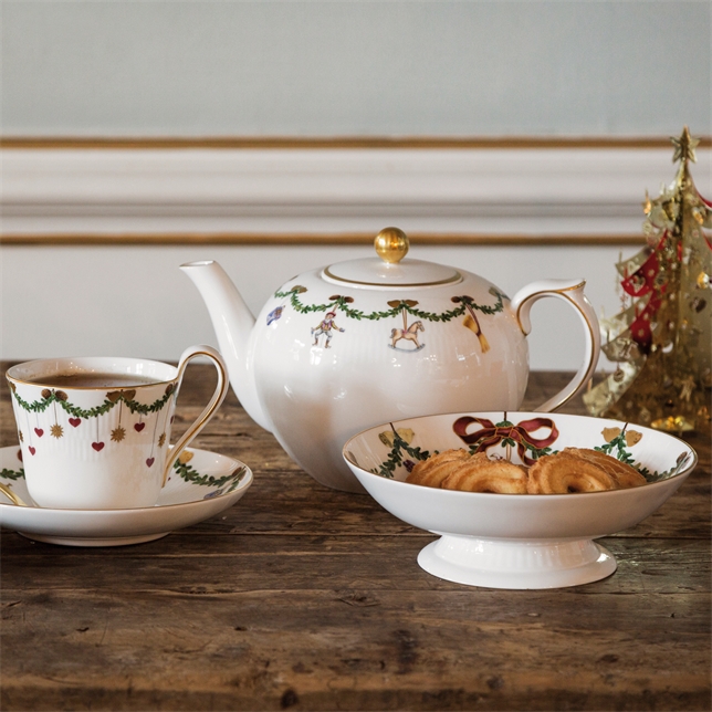 Sätt stämningen för lugna semesterkvällar runt bordet med denna tekanna i det älskade mönstret Star Fluted Christmas. Granens kransar är prydda med de vackraste prydnadsföremålen som sprider julglädje i alla rum. Tekannan på 140 cl har ett klassiskt handtag, som är dekorerad med gyllene detaljer som även syns på lock och pipe. En favoritbit för semestergemenskap. Ingenting kapslar in semesterns anda som att samlas runt bordet för mysiga stunder av glädje och samvaro. Det är här den älskade julserveringen från Royal Copenhagen har kommit till liv och blivit en del av många semestertraditioner. De festliga kransarna av gran som gränsar till tallrikar, skålar och koppar är prydda med rosetter i sidenband och juldekorationer, vilket skapar en rik och elegant servis,