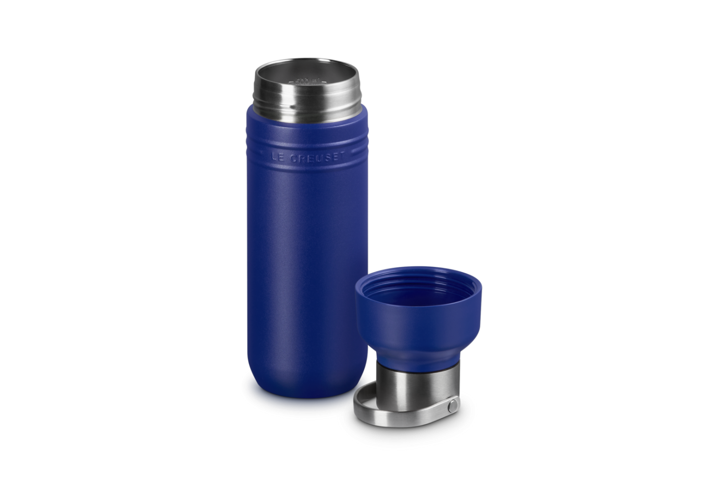 On The Go-flaskan från Le Creuset är utformad för att vara bekväm och har en smal toppöppning som gör det enkelt att dricka. Dessutom har den en större öppning vilket är perfekt när du vill lägga till isbitar eller något annat. Det gör det också lätt att fylla och rengöra. Med vakuumisolering med dubbla väggar håller sig dina drycker varma eller kalla i flera timmar.