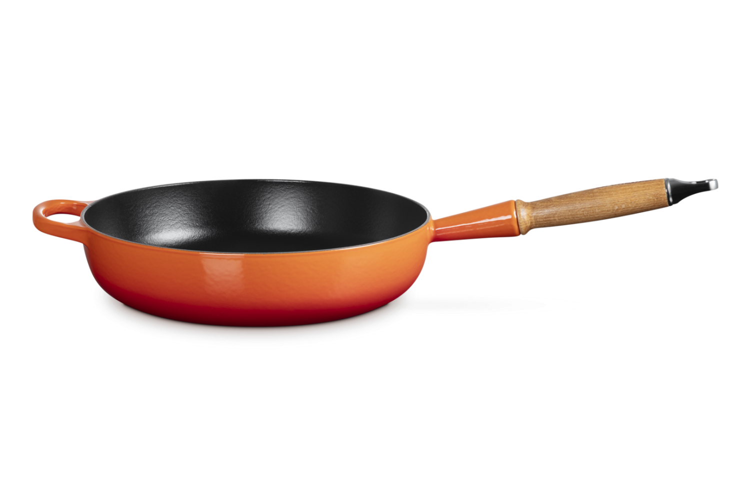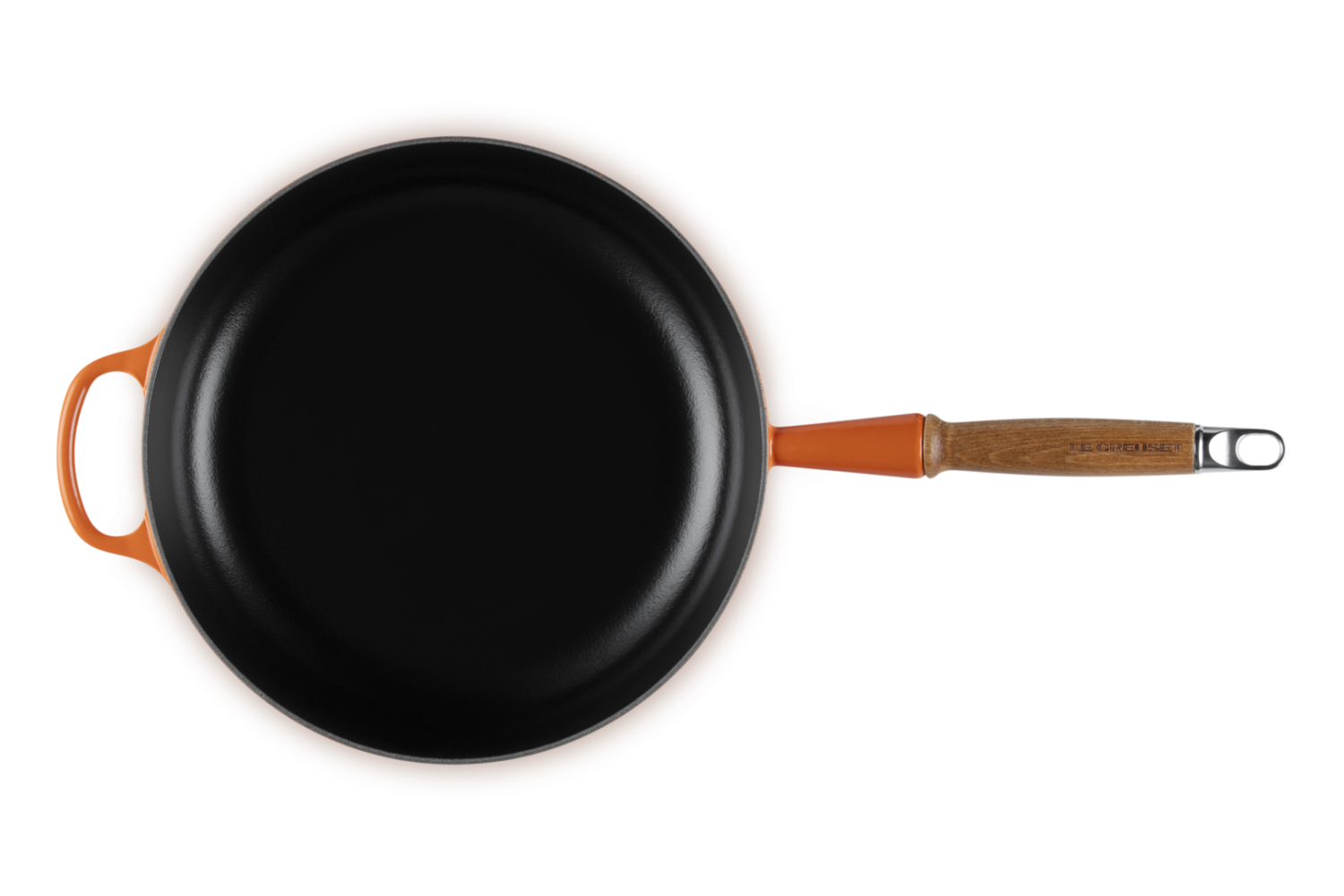 Vår Signature traktörpanna i gjutjärn passar perfekt för att laga många olika läckra rätter och gör stekning och sautering till en fröjd. Den har en snygg, modern design med höga kanter som håller kvar vätskan i pannan, ett trähandtag som förblir svalt samt ett stort hjälphandtag som gör det enkelt att greppa och flytta pannan. Den här snygga pannan kan du använda på vilken värmekälla som helst förutom i ugnen. För att bevara handtaget bör du inte diska den i diskmaskinen.