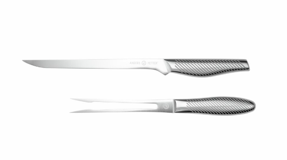 Slitstarkt trancherset från Anders Petter med en stekgaffel och en filékniv (55 HRC/28° slipvinkel) som motstår korrosion och slitage. Utrustat med ergonomiska handtag för ett bekvämt och stadigt grepp vid all typ av uppskärning.
