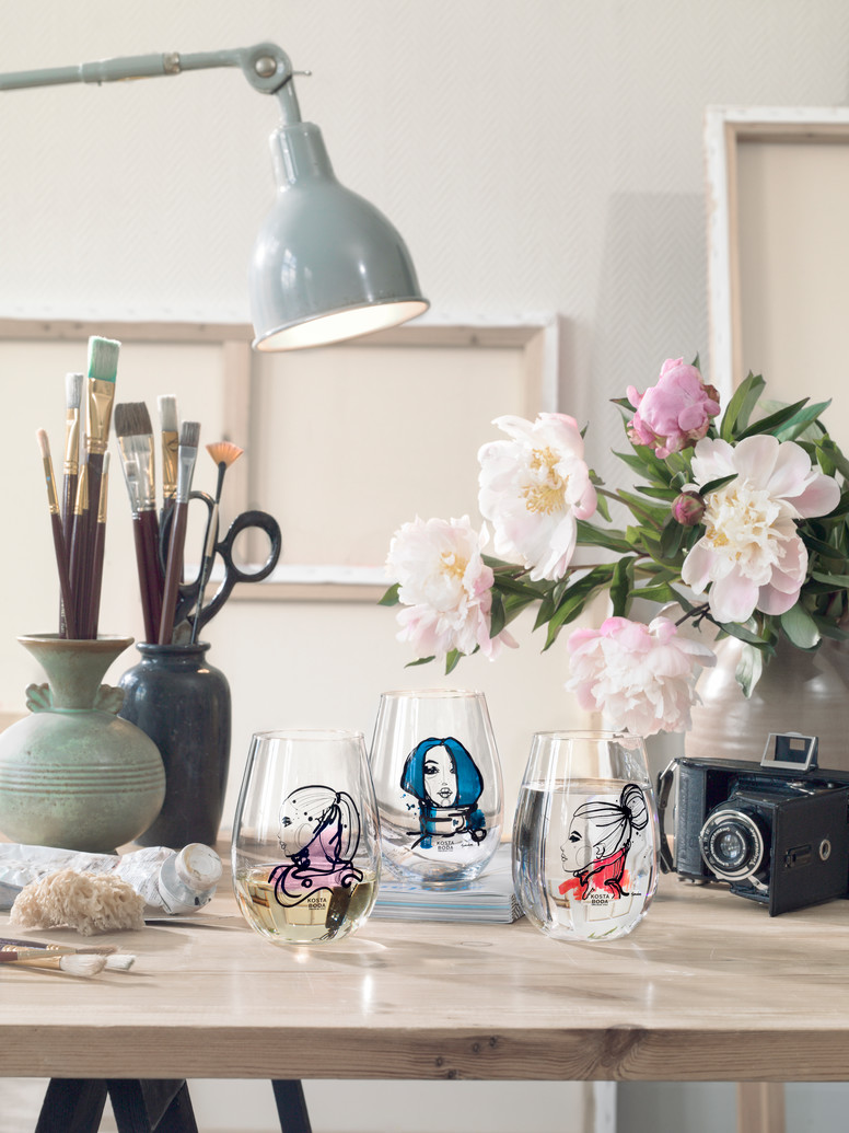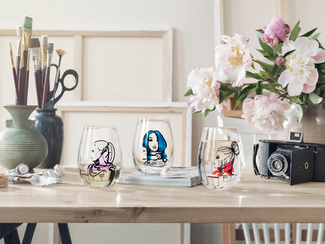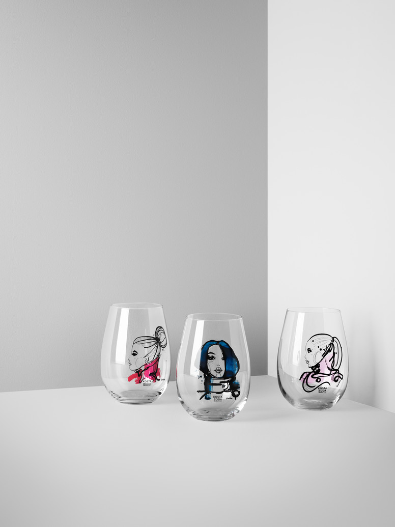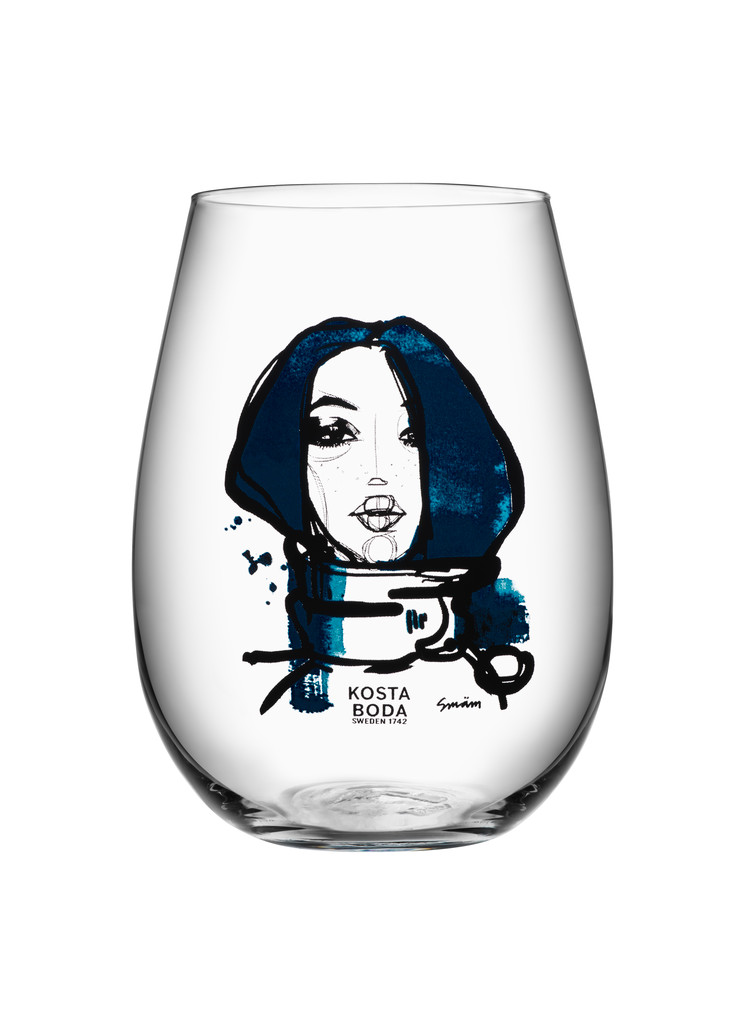 Tumblerglasen i serien All About You från Kosta Boda handlar om kärlek, längtan och passion - starka känslor fångade i glas med sparsmakad design och illustrerade motiv med influenser från modevärlden. Glaset Miss You är blått, en färg som ofta förknippas med saknad. Design Sara Woodrow. Dricksglas Vattenglas