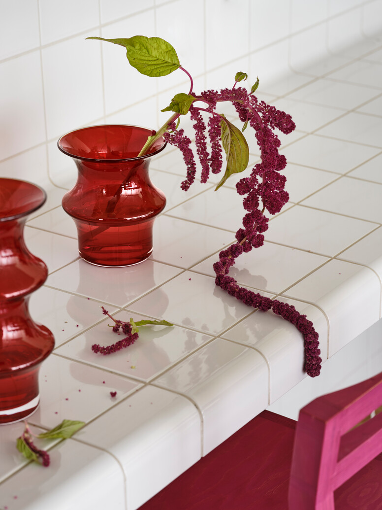Serien Pagod från Kosta Boda är munblåst och gjord med så kallad underfångsteknik, vilket ger ett välarbetat och stilrent resultat. Ett lager färgat glas täcks av ett hölje klarglas, vilket ger den inre färgen ett extra djup och skimmer. Den röda vasen är ett tempel för snittblommor och höjer dem till skyarna. Design av Anne Nilsson.