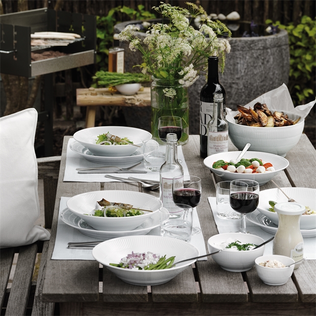 De omålade flöjterna i den lilla 47 cl White Fluted skålen förkroppsligar den förenklade stilen i denna tidlösa kollektion. Storleken är idealisk för mindre portioner eller som flingskål. White Fluted är skapad från basformen i Blue Fluted Plain-kollektionen och är minimalistisk, osmyckad och evigt klassisk. Den rena vitheten i den enkla kollektionen gör att varje pjäs sticker ut den handgjorda elegansen, och framhäver de ikoniska flöjterna i porslinet. Varje bit av White Fluted är vacker för sig och i kombination med en eller flera av Royal Copenhagens handmålade middagsserviser.